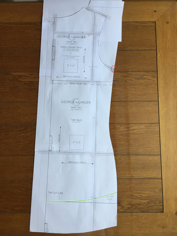 Take the tank top back. Lengthen the rounded bottom line of the flowy tank (yellow line on the photo) with 2,5 inch. We use the side seam from the fitted tank.