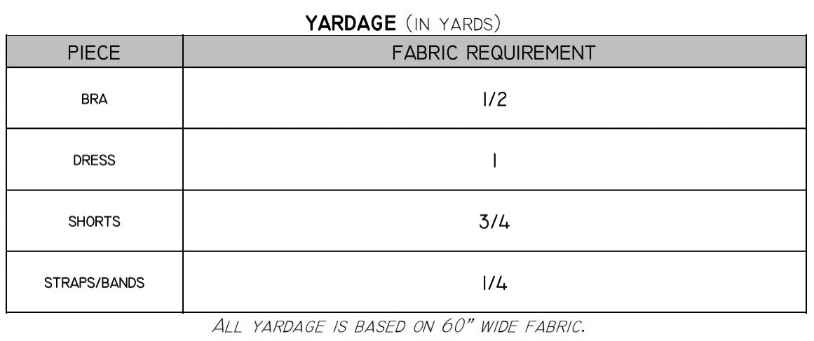 Suggested fabric for this pattern is a 4-way knit with at least 50% stretch, such as cotton lycra or athletic knit.