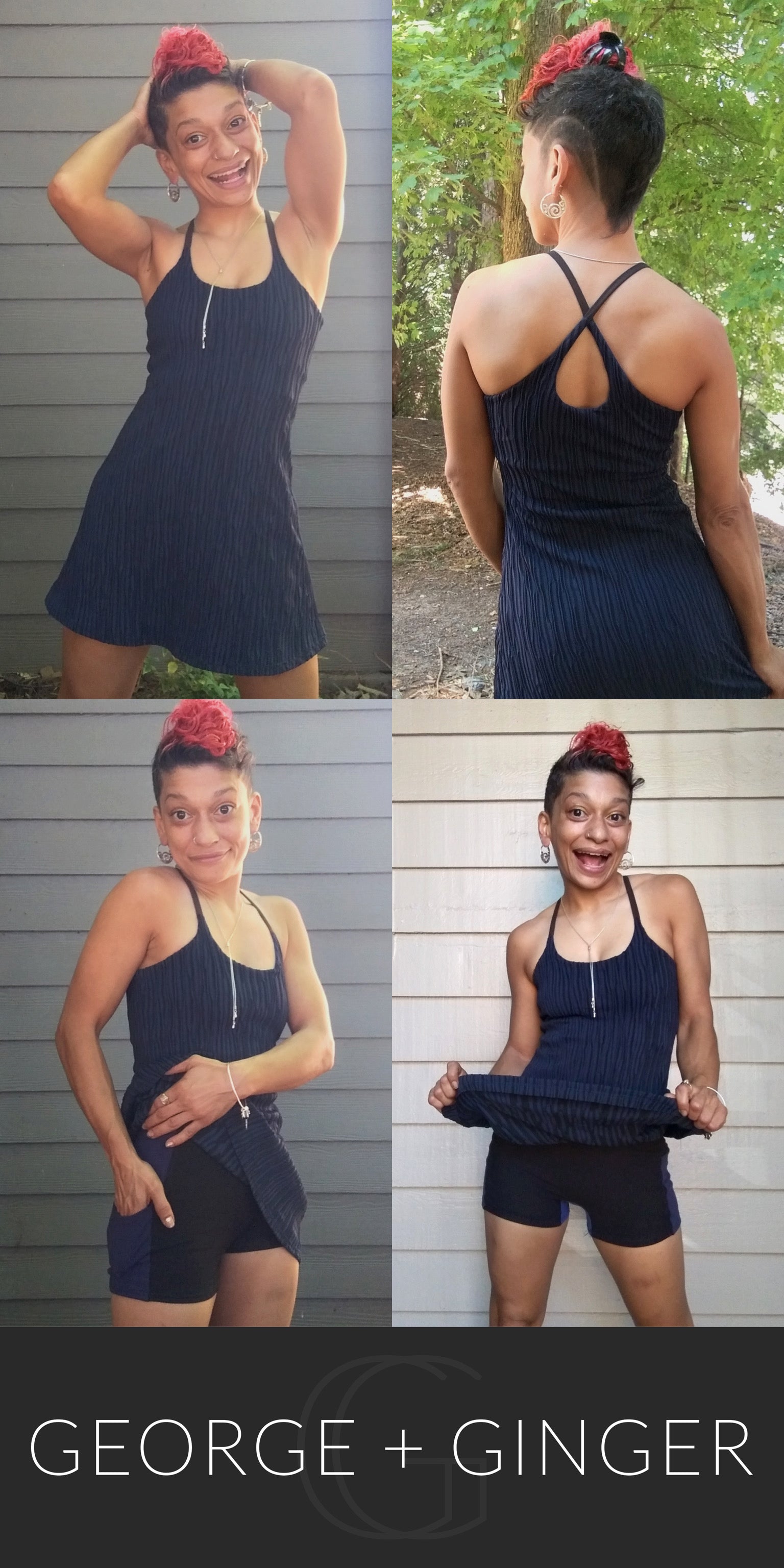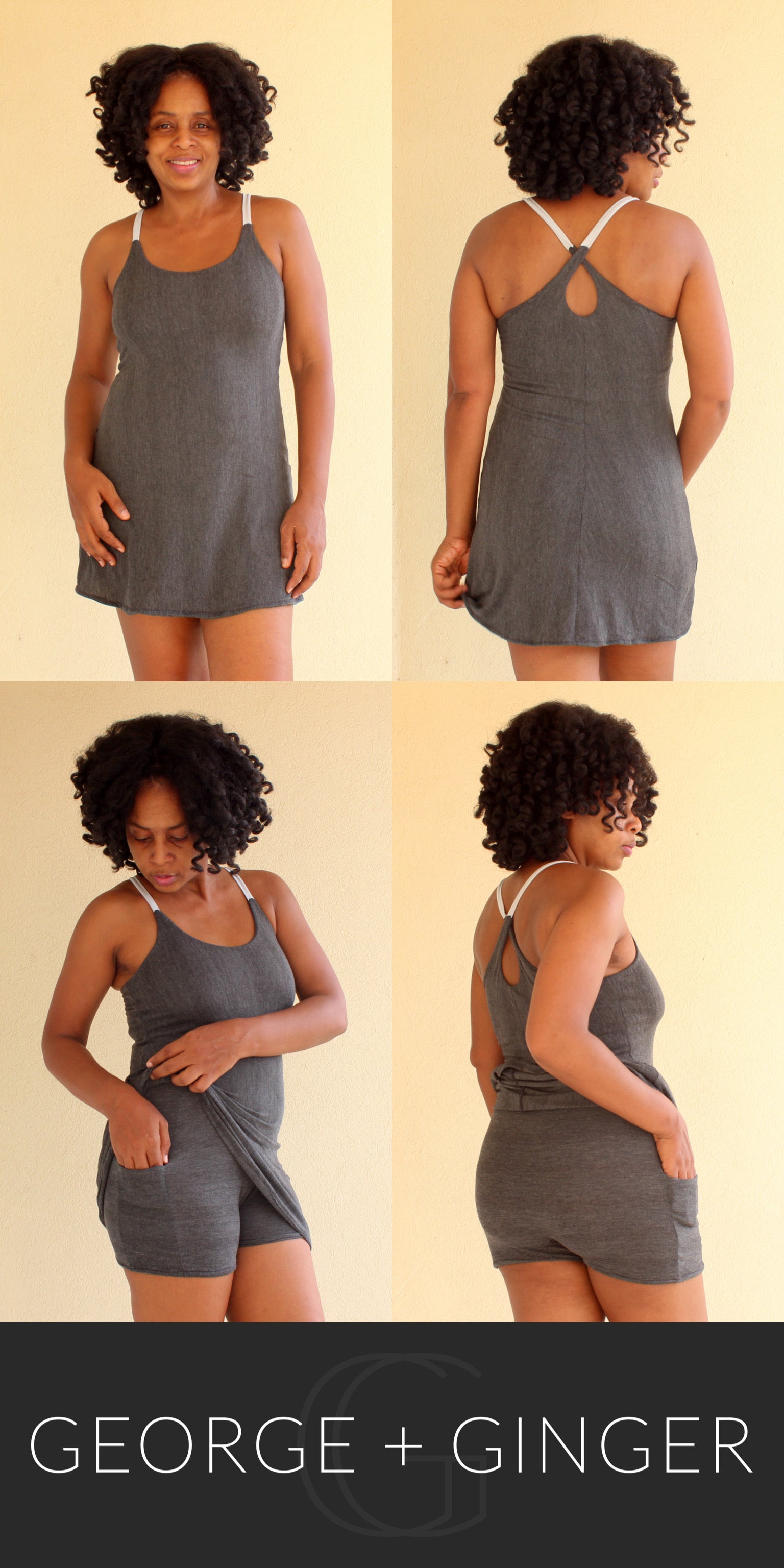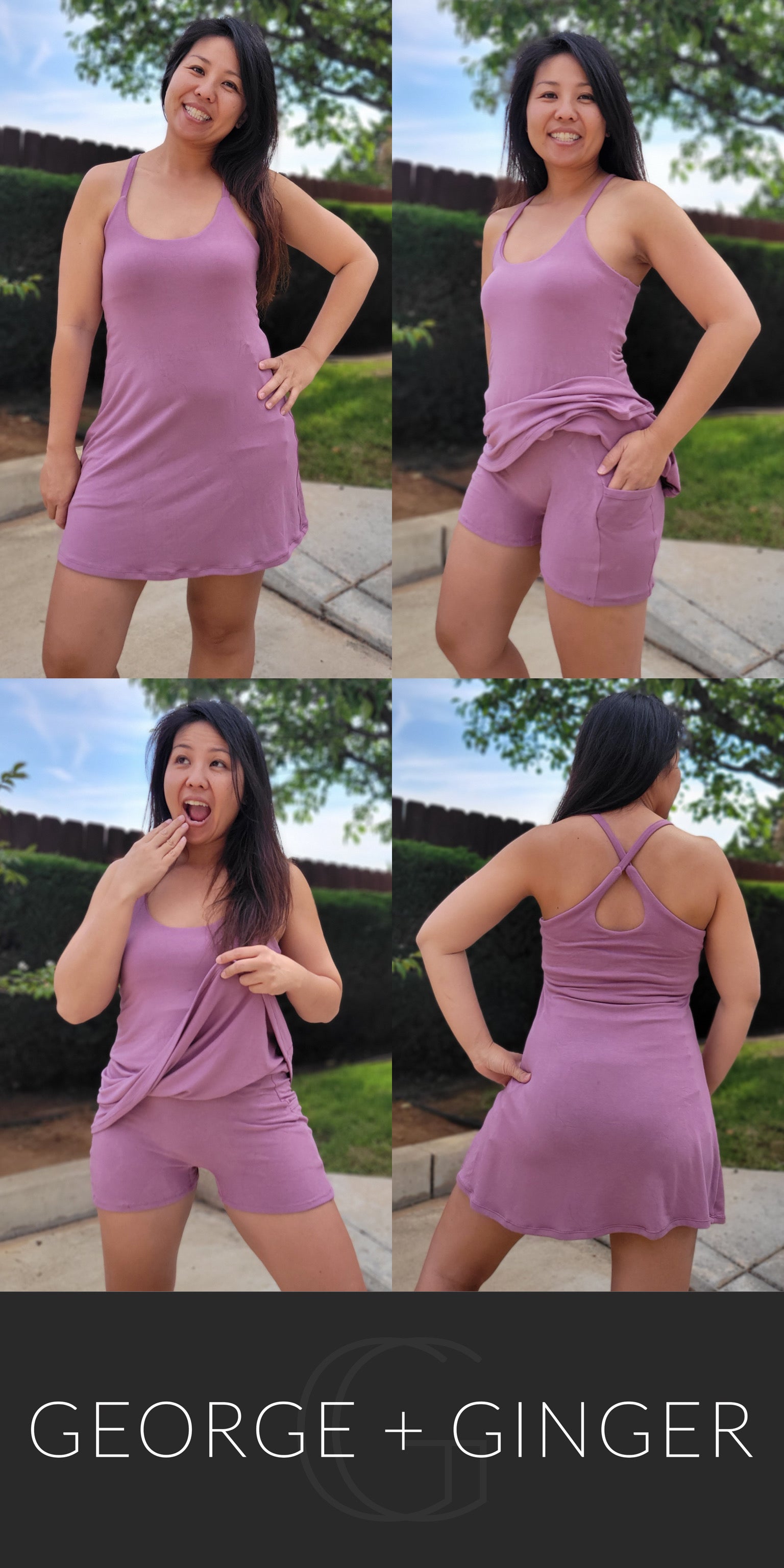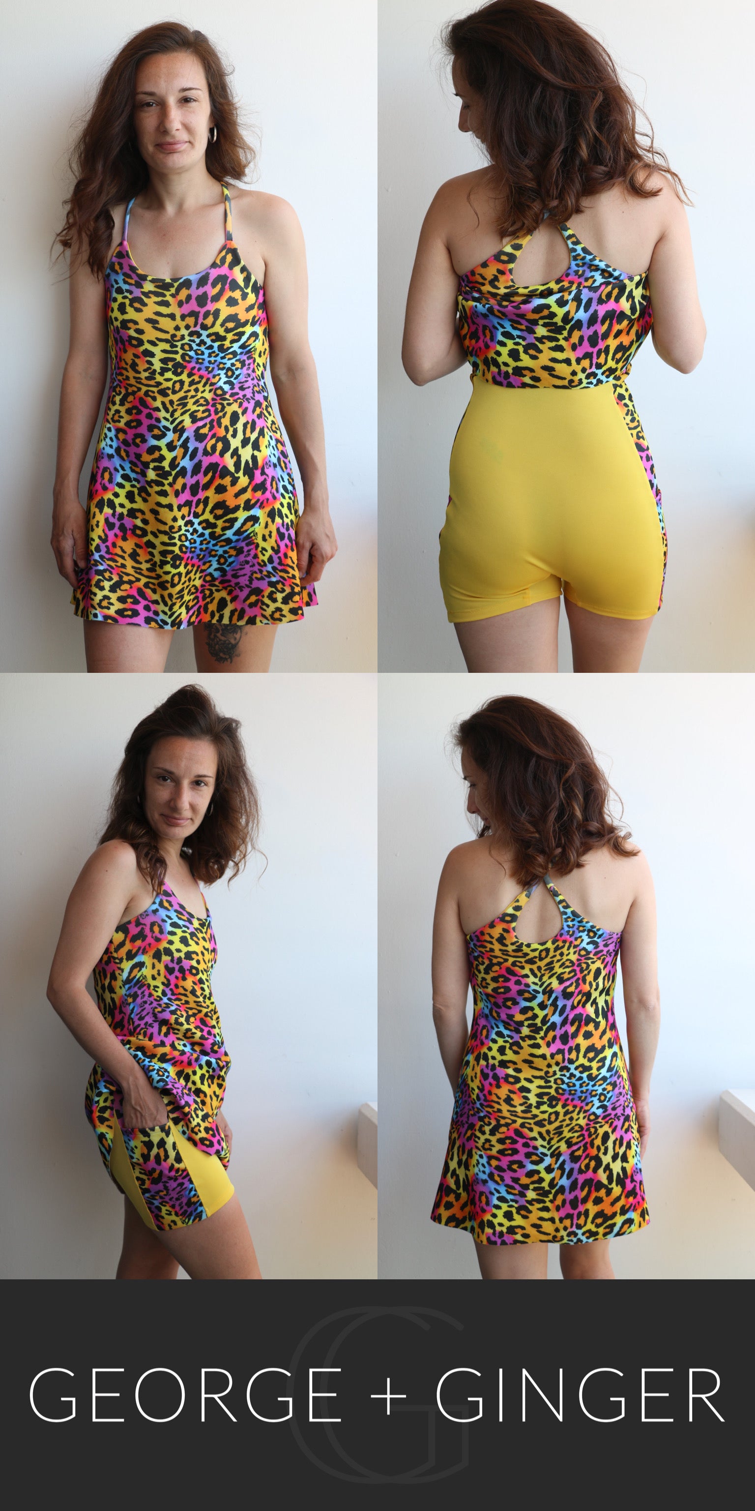 The Solar Sundress is a strappy, all-in-one design--featuring a built-in shelf bra and attached shorts for maximum support, booty coverage and overall comfort on the go!  Side seam pockets are also included for added convenience.