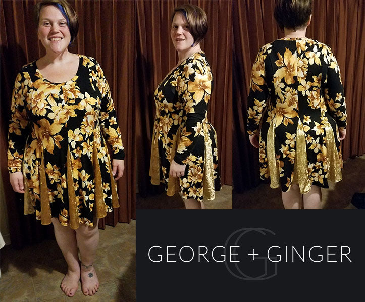 Suggested fabric for this dress is a 2-way or 4-way knit fabric with 50% stretch.