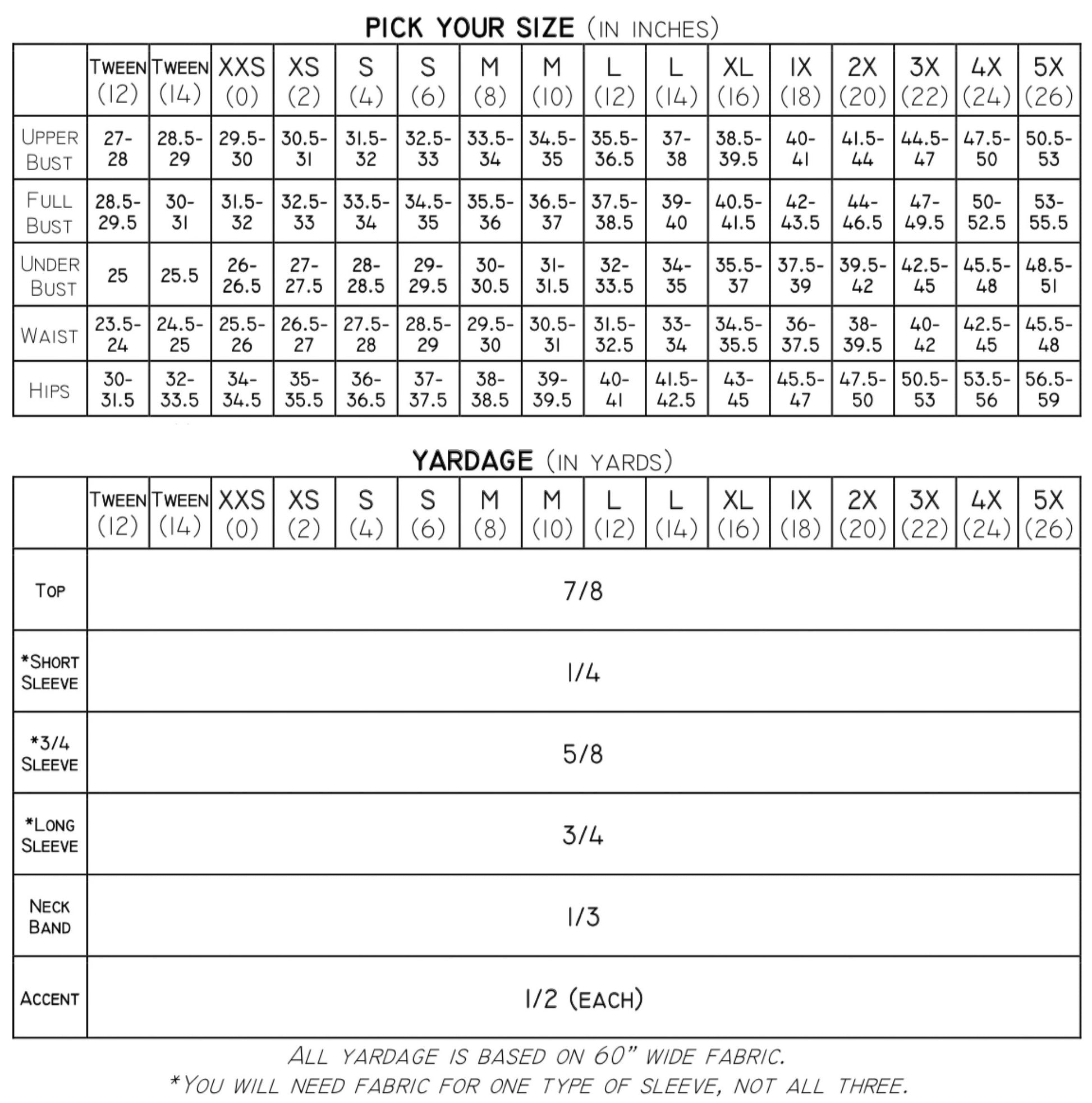 Suggested fabric for this pattern is any medium to heavyweight knit fabric with 50% stretch for the top. Explore other light weight, flowy fabrics for the accents, including woven!