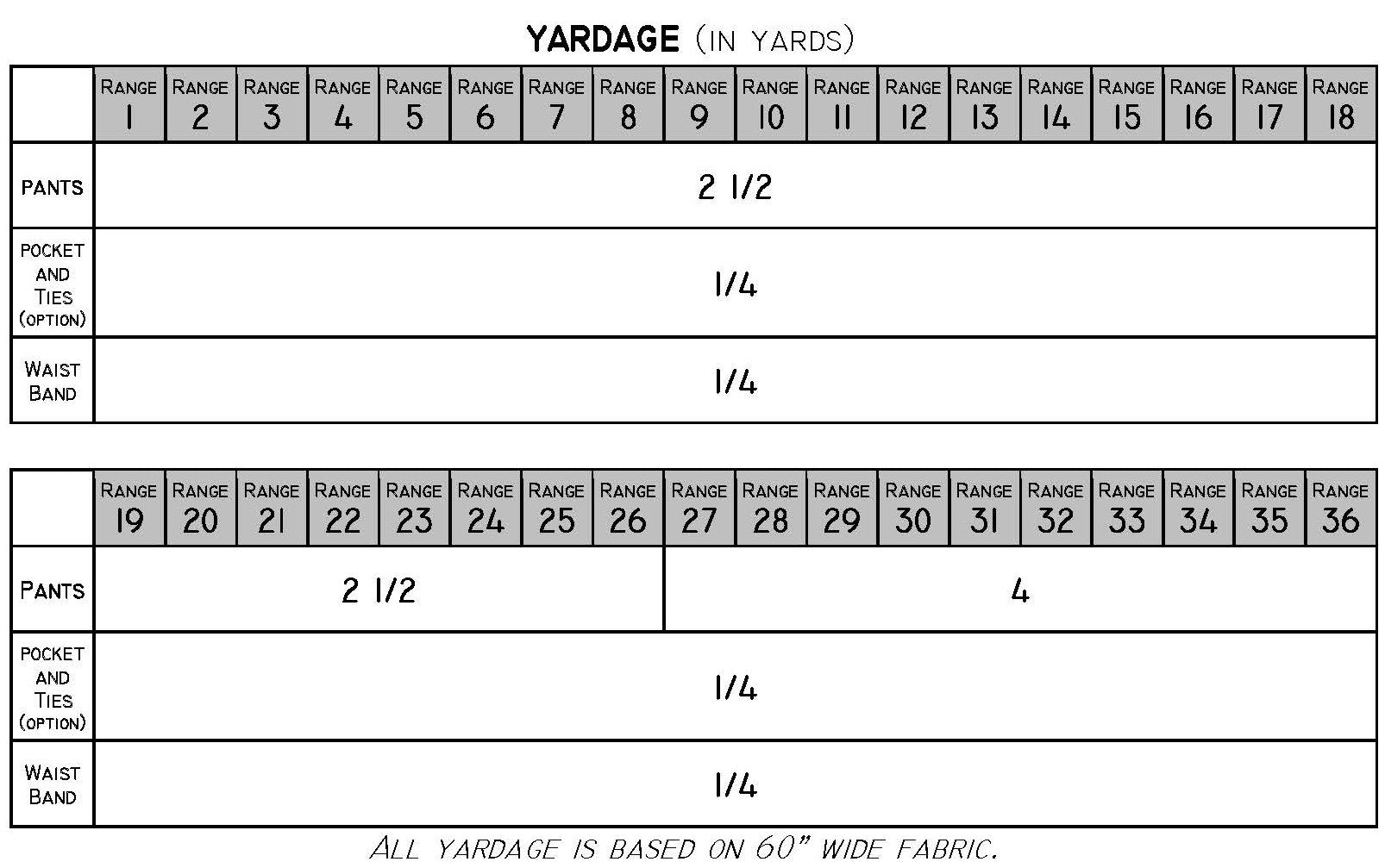 Yardage requirements and notions list