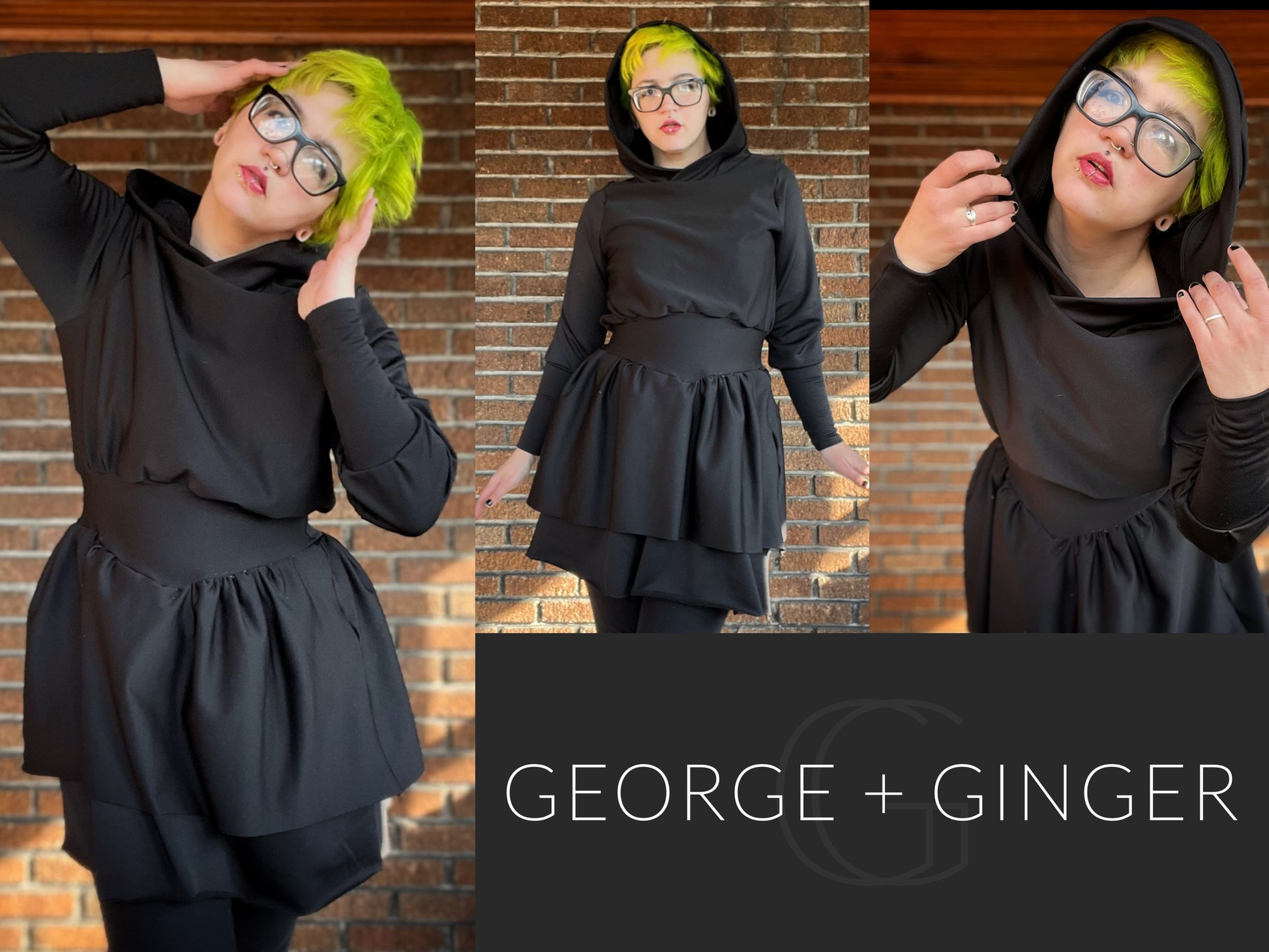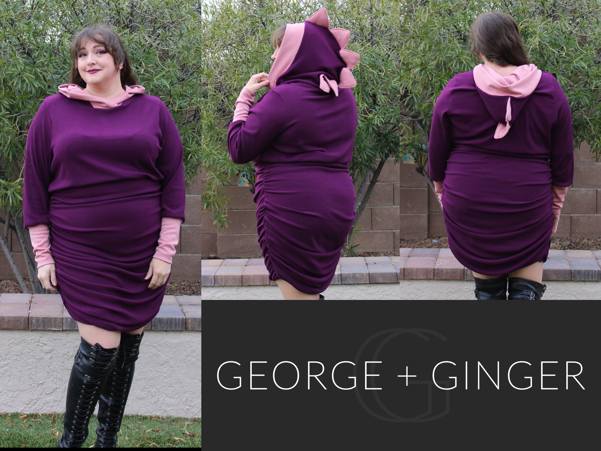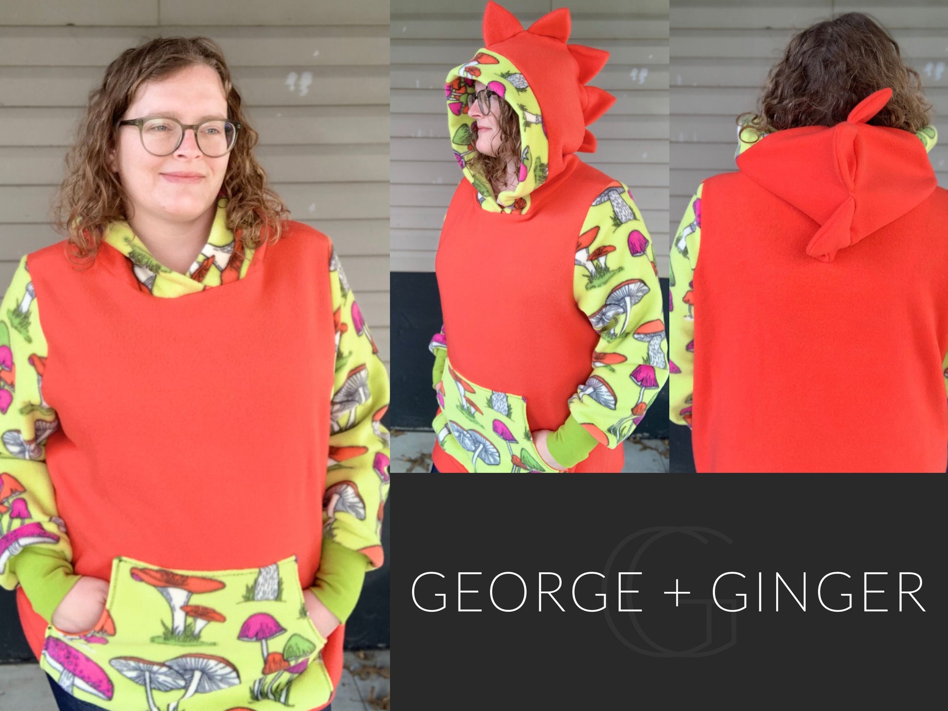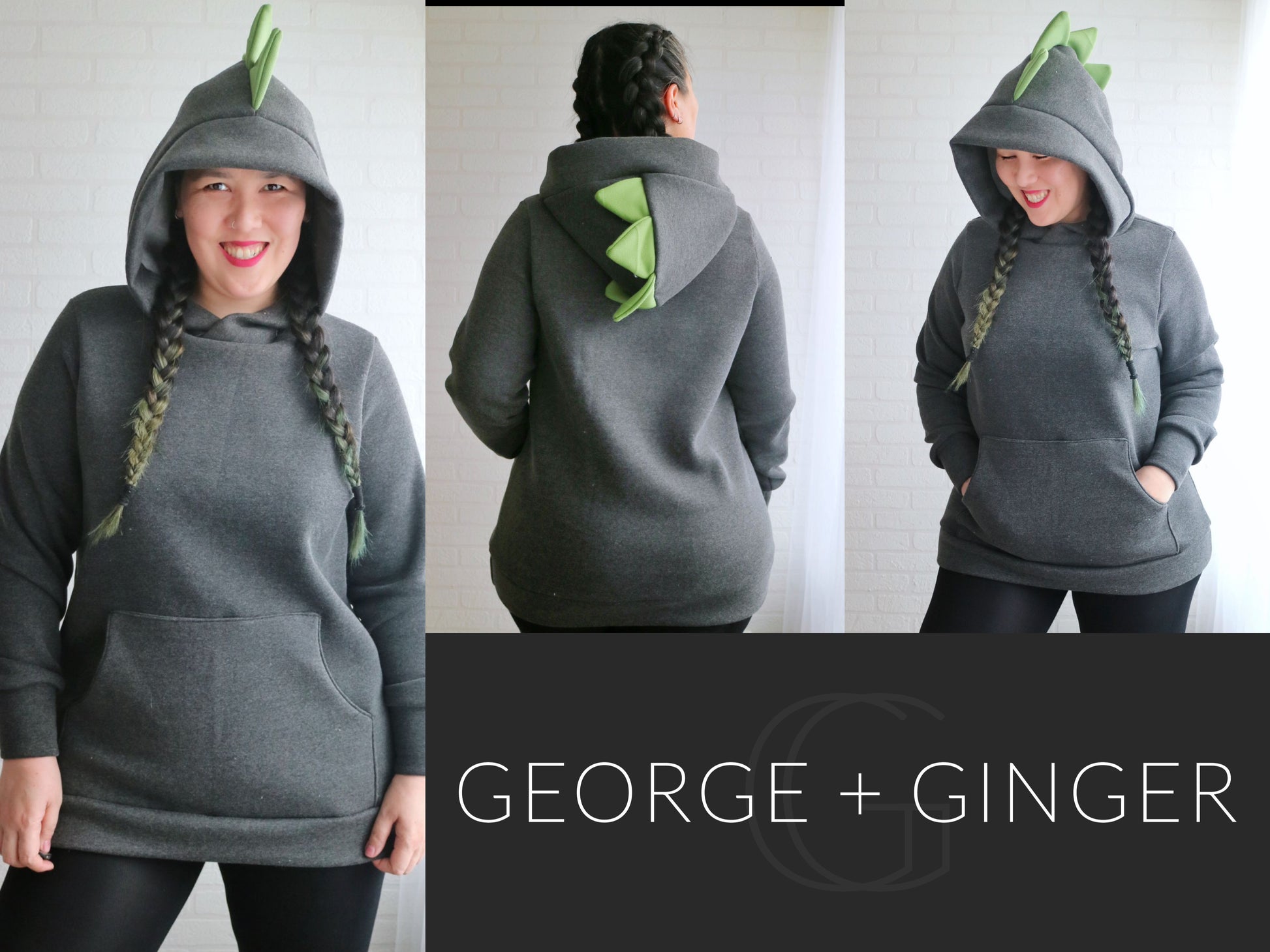 The Trefoil Hoodie Dress will be the last hoodie pattern you will ever need! Three lengths (bodice, cropped and regular), three sleeve styles (basic, cropped and pleated) and three skirt options (basic, ruched and ruffle)! Not to mention the added accessories such as a kangaroo pocket, four different sets of ears and cute dino spikes for the banded hood! So many choices…