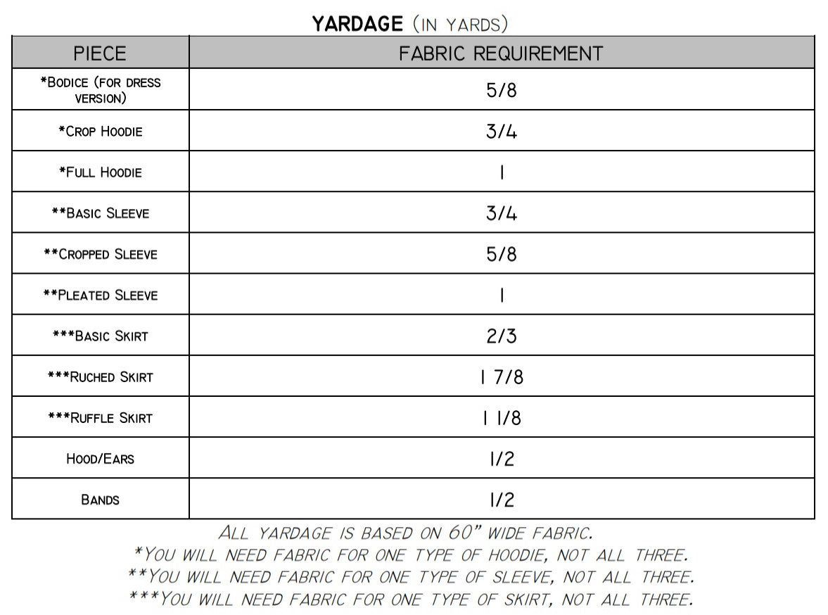 Suggested fabric for this pattern is sweatshirt fleece with at least 15% stretch for the hoodie bodice, sleeves and hood. We suggest rib knit with 50% stretch for the hoodie waistband, skirts and sleeve cuffs. However, any knit fabric such as cotton lycra, french terry, ponte, athletic knit or scuba will work−−but may not give the same effect.