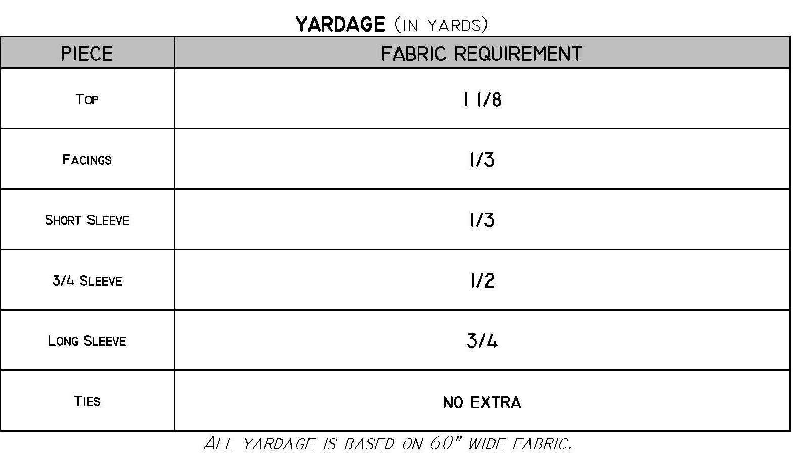 Yardage requirements and notions list