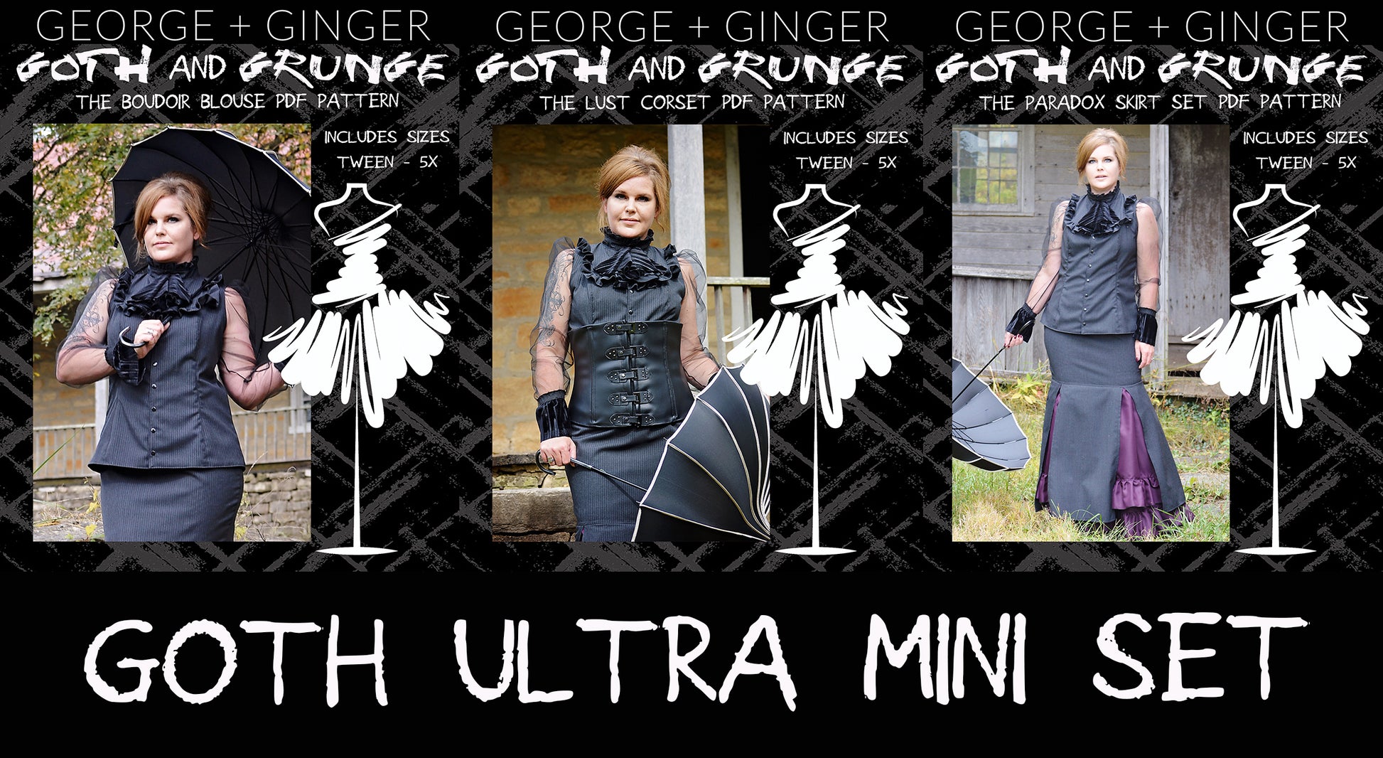 This listing is for all three patterns in the ULTRA Goth Mini Set--The Boudoir Blouse, The Lust Corset and The Paradox Skirt Set!
